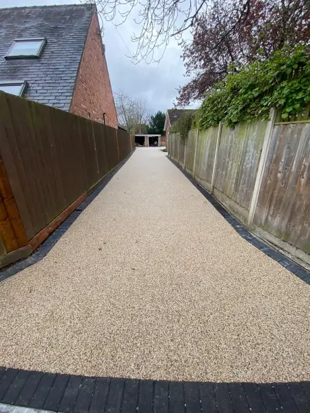 At Ashfield Paving, we pride ourselves on creating durable, visually appealing driveways that improve our clients' properties. Our recent project in Hucknall, Nottingham, involved installing a resin bound driveway in a beautiful light-sand colour. This long driveway leads to a double garage, and to add a striking finish, we bordered it with dark brick pavers, creating a sharp contrast that emphasises the driveway’s design.